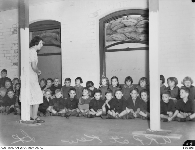Description: This is a copy of an image from the collection of the Australian War Memorial. [From catalogue description:] Melbourne, VIC. 1942-06-10. Pupils of the St Anthony’s Babies Home, Kew, sit quietly in their sand bag and concrete shelter during an air raid precaution practice.