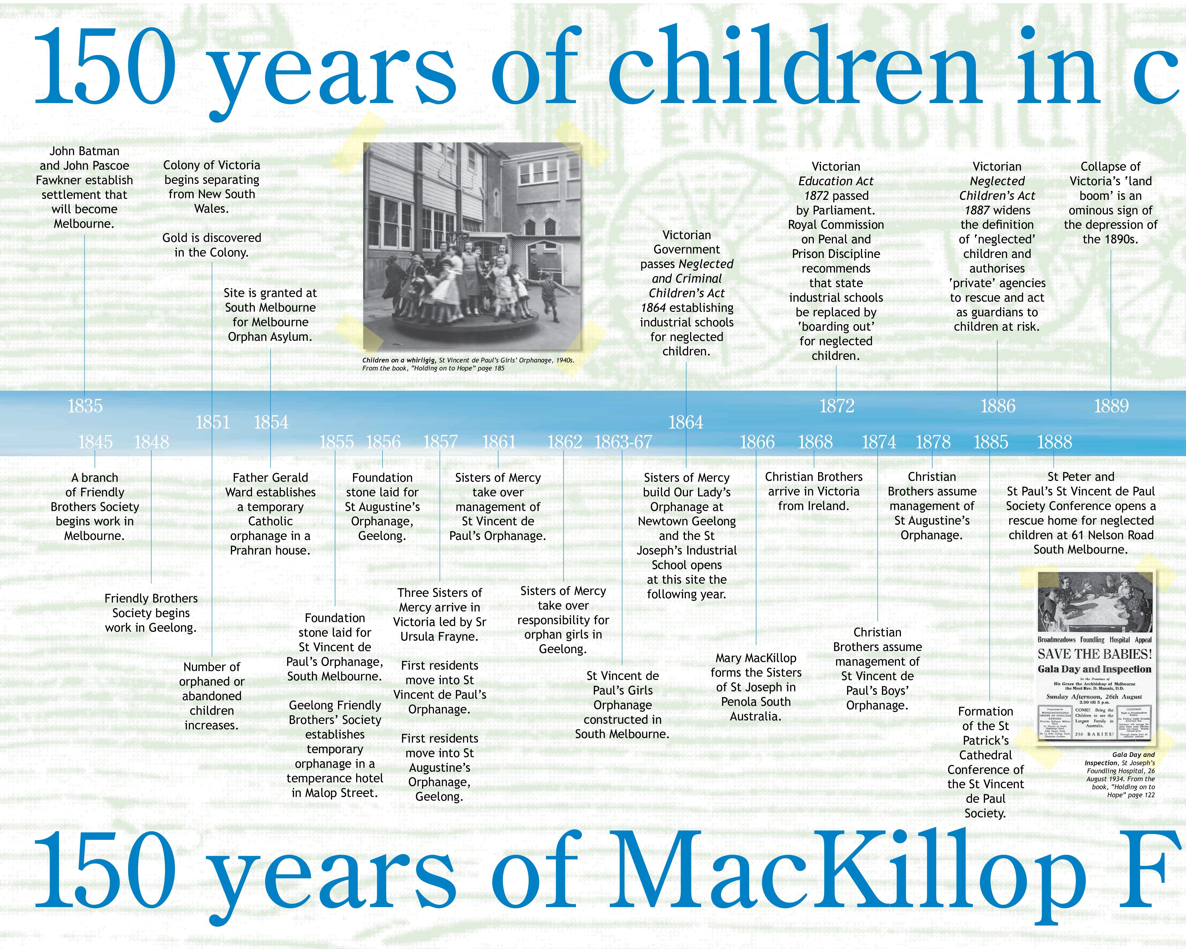 Description: This is a copy of a Wall Chart produced by MacKillop Family Services to document its involvement in the child welfare sector from 1855-2005.