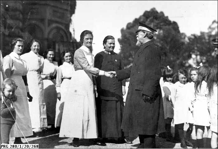 Description: This image shows children from the Girls’ Probationary School. The library description states: Women greeting a senior Salvation Army officer visiting a children’s institution.