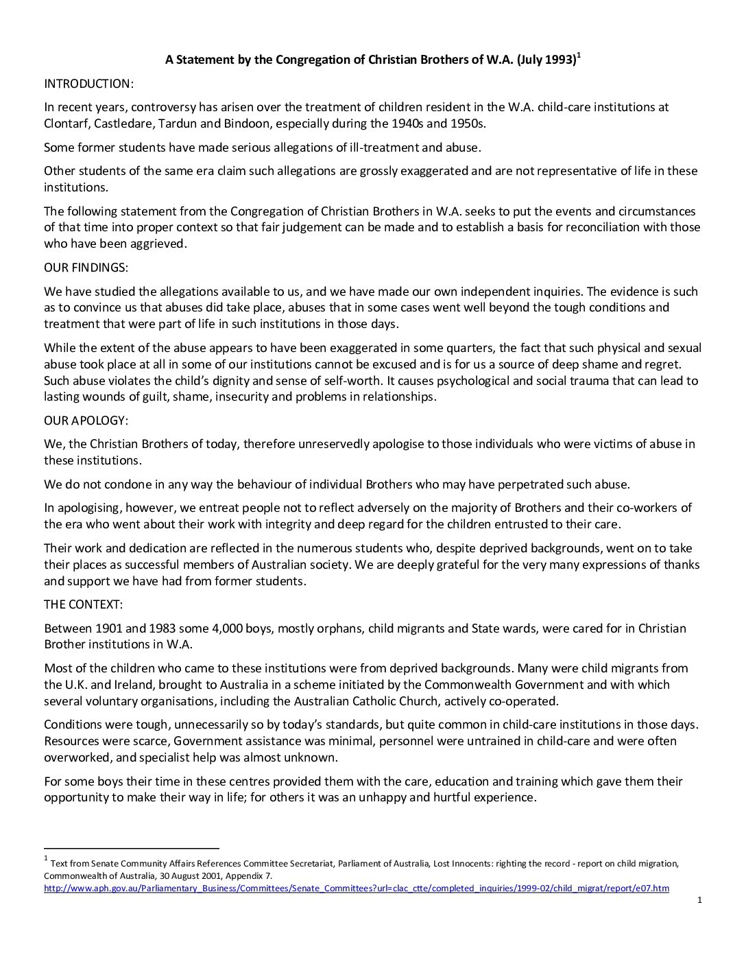 Description: In July 1993, the Christian Brothers issued an apology to former child migrants and other residents of Christian Brothers’ Homes in Western Australia.