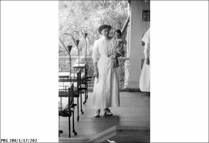 Description: The library description states: A woman, possibly a doctor of the South Australian Babies’ Home holding a very young child, she stands by several children’s cots. Location is possibly the Babies’ Home at Gawler Terrace, Walkerville where the Matron in charge was Miss A.T.C. McGahey.