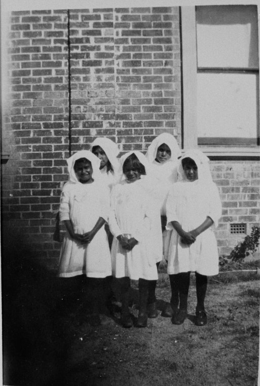 Description: This is a digitised copy of a negative and is part of the Collection of Photographs from the Royal Western Australian Historical Society held at the State Library of Western Australia. The image shows five girls from the St Joseph’s Native School and Orphanage, New Norcia.