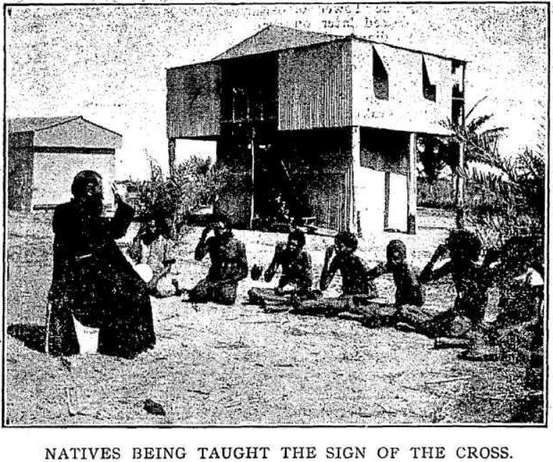 Description: This is a photograph taken at Drysdale River Mission showing seven Aboriginal people seated on the ground in front of one of the Benedictine Fathers of the Mission. All have their hands up to their foreheads and appear to be making the sign of the cross. In the background some of the Mission buildings are visible. The image was one of several published in The W.A. Record in an article titled ‘Drysdale River Mission. Some Interesting Facts’.