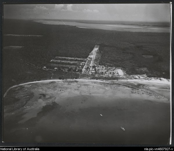 Aerial view of bay and Methodist Mission settlement, Elcho Island, Northern Territory, 1958?