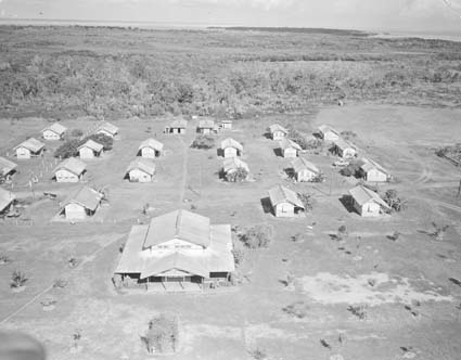 Description: The full title is recorded as: Aerial view of the Bagot Aboriginal Reserve, near Darwin, NT. There are 26 family cottages and three dormitories. An average of about 150 men, women and children live there.