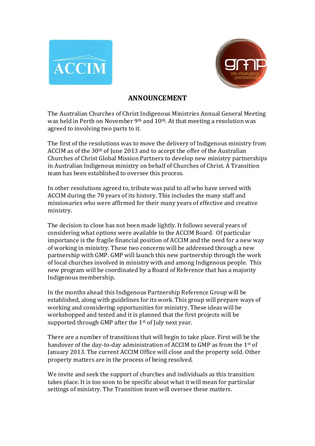 Description: ‘Announcement’ is a statement by the ACCIM (Australian Churches of Christ Indigenous Ministries) and GMP (Global Mission Partners) about the decision to move Churches of Christ Indigenous ministry to the Australian Churches of Christ Global Mission Partners, and close the ACCIM.