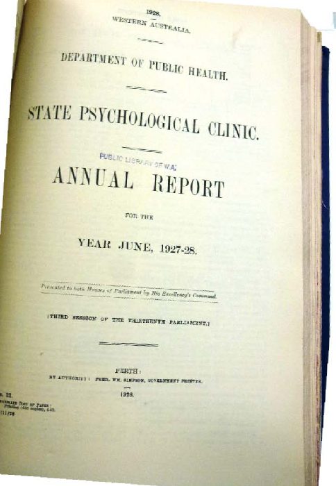 Description: This is a digital copy of the Annual Report of the State Psychological Clinic for the year ending June 1928. It is part of the Minutes, Votes and Proceedings of the Western Australian Parliament. It shows the complicated tests that were used to classify and diagnose children with intellectual and psychological disabilities. The report also gives information about current and planned ‘treatments’.
