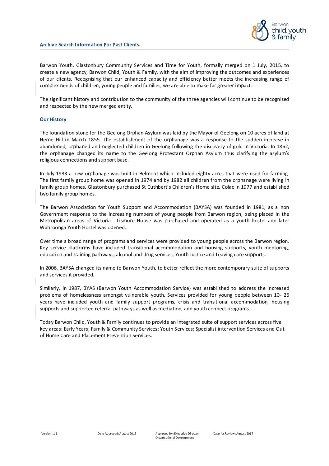 Description: This document provides archival search information for past clients of Barwon Child, Youth & Family including the application to access client records.