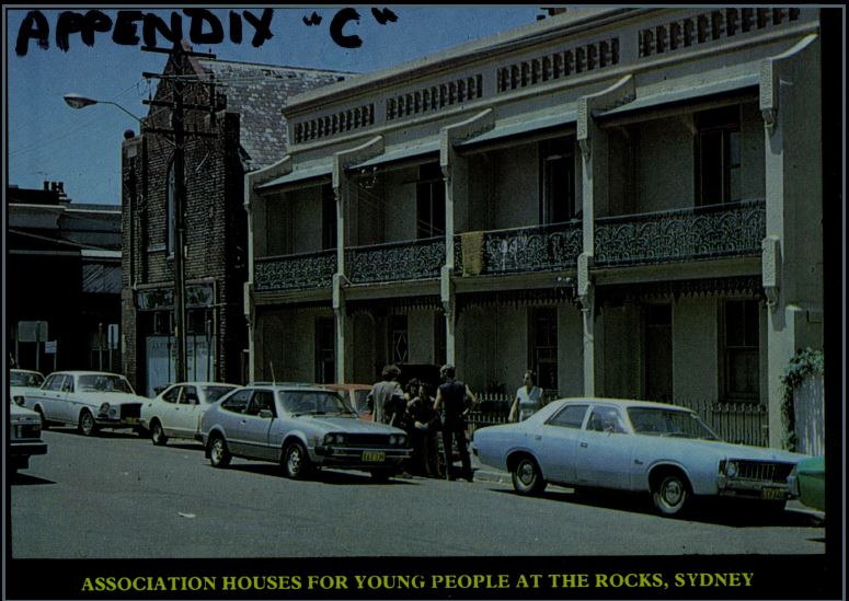 Description: This is a copy of an image that appeared on the front cover of “Choices”, the magazine of the New South Wales Homeless Children’s Association, in March 1983. It shows houses in Cumberland Street, The Rocks, that were the location of a residential facility for homeless young people run by the Association.