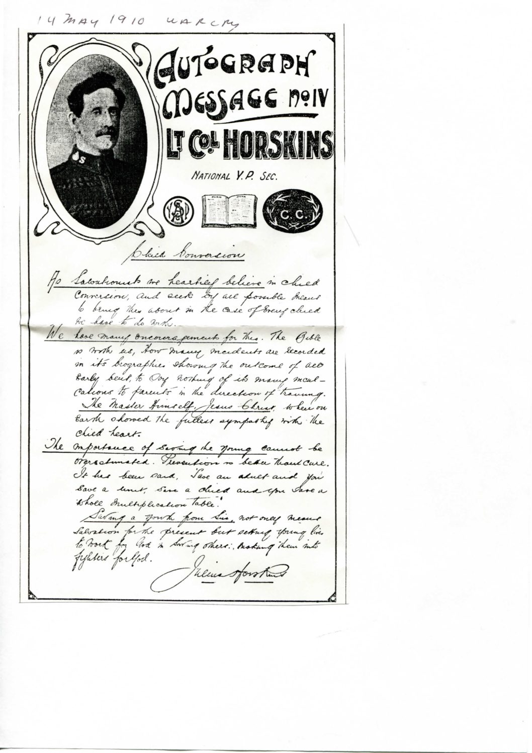 Description: ‘Autograph Message No. IV. is a digital copy of a photocopy held in the Hopetoun closed social work file at the Salvation Army Heritage Museum WA and published, according to a handwritten caption, in the War Cry on 14 May 1910. This item gives insight into the importance of ‘child conversion’ in the Salvation Army theology.
