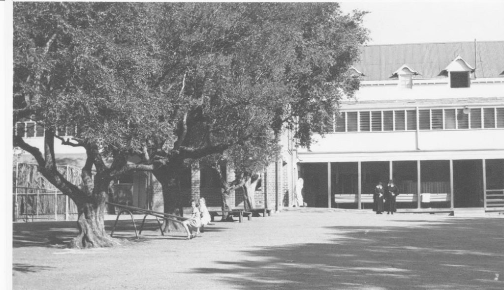 Description: ‘Back of St Joseph’s main building’ is a digital copy of an undated photograph from the Institute of Sisters of Mercy of Australia and Papua New Guinea Archives and Heritage Centre. It shows two girls on a see-saw and some sisters. An approximate date range of 1920 to 1960s has been given, based on the children’s clothing.