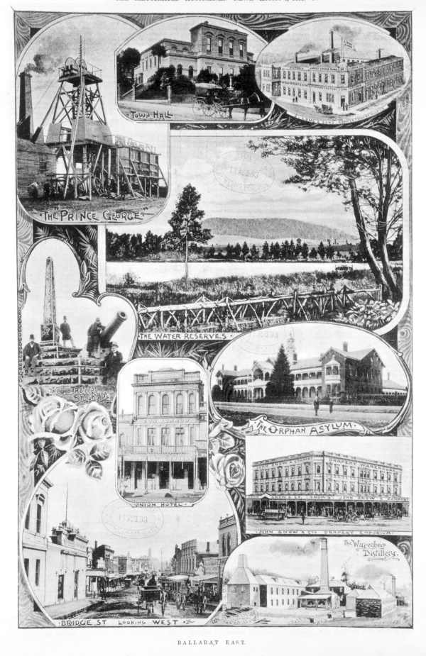Description: This image from the Illustrated Australian News, 1 August 1893, has drawings of major public buildings and infrastructure in Ballarat, including the Orphan Asylum.