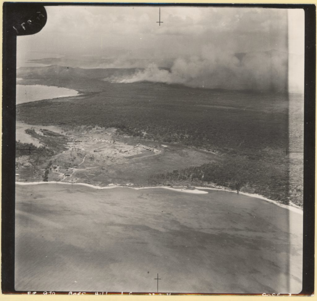 Description: This is an aerial photograph showing the site of the Lockhart River mission. It shows a clearing of land at the base of Bare Hill (near the Lockhart River) with two rows of buildings at the rear of the site, another smaller of group of buildings to the right of these, and a couple of buildings scattered near the beach. The Lockhart River Mission Road can be seen running through the site. This image is one of a series of three images showing the site from different angles.