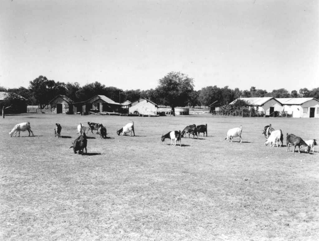 Description: This is a digital copy of a photographic print and is part of the group of four images titled ‘Beagle Bay Mission, July 1953 [picture]’ held at the State Library of Western Australia. The images shows goats grazing on the grounds of Beagle Bay Mission with the buildings of the mission in the background.