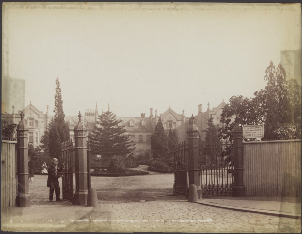 Description: This is a copy of a photograph from State Library Victoria. It shows a sign on the fence of the Benevolent Asylum which reads: “Visiting Days Tuesdays and Fridays from noon until three o’clock”.