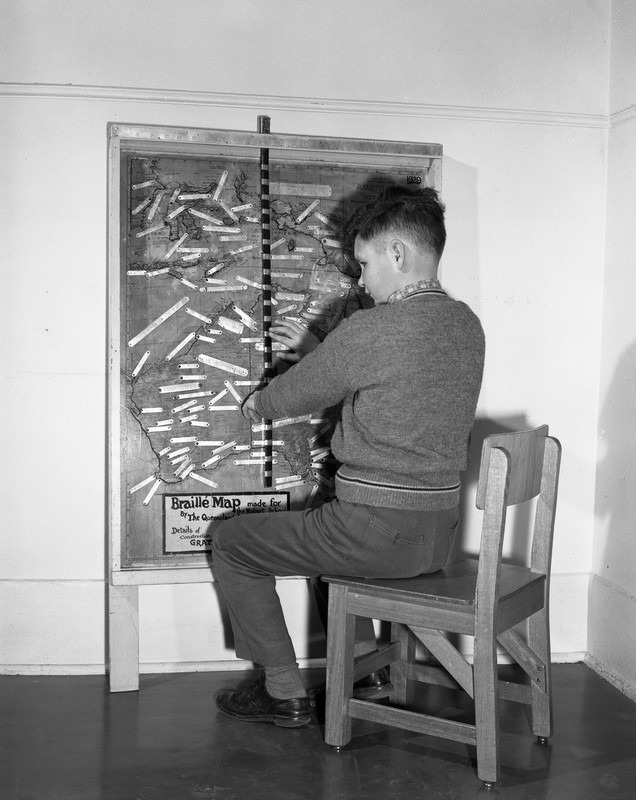 Blind & Deaf Institute, visually-impaired boy reading a Braille map, 1951 to 1973