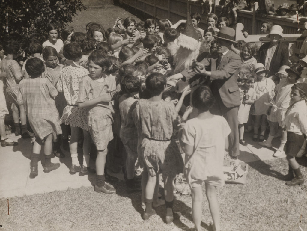 Description: This is a digitised copy of a photographic print and is part of the Boans collection of photographs held at the State Library of Western Australia. The images shows children from the Perth Girls’ Orphanage receiving presents from the Boan’s department store Father Christmas, in 1930.