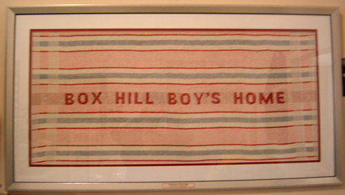 Description: This is an image of a towel with the words “Box Hill Boy’s Home” embroidered on it.