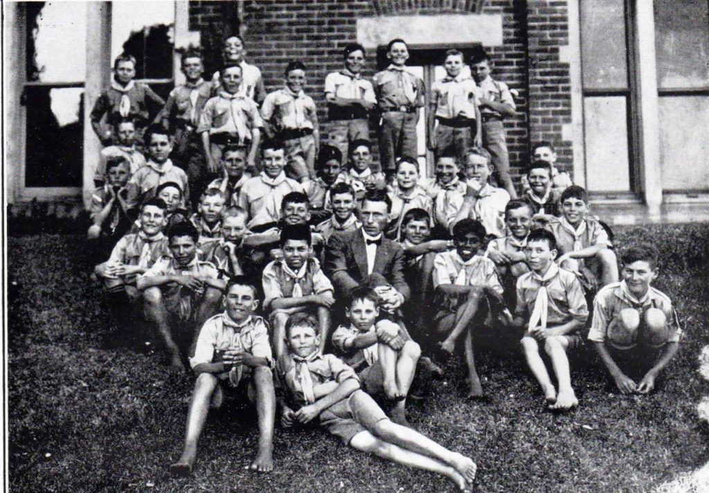 This image shows a group of approximately 40 boys and one man sitting or standing on the grass in front of a brick building. The boys are all wearing scouting uniforms.