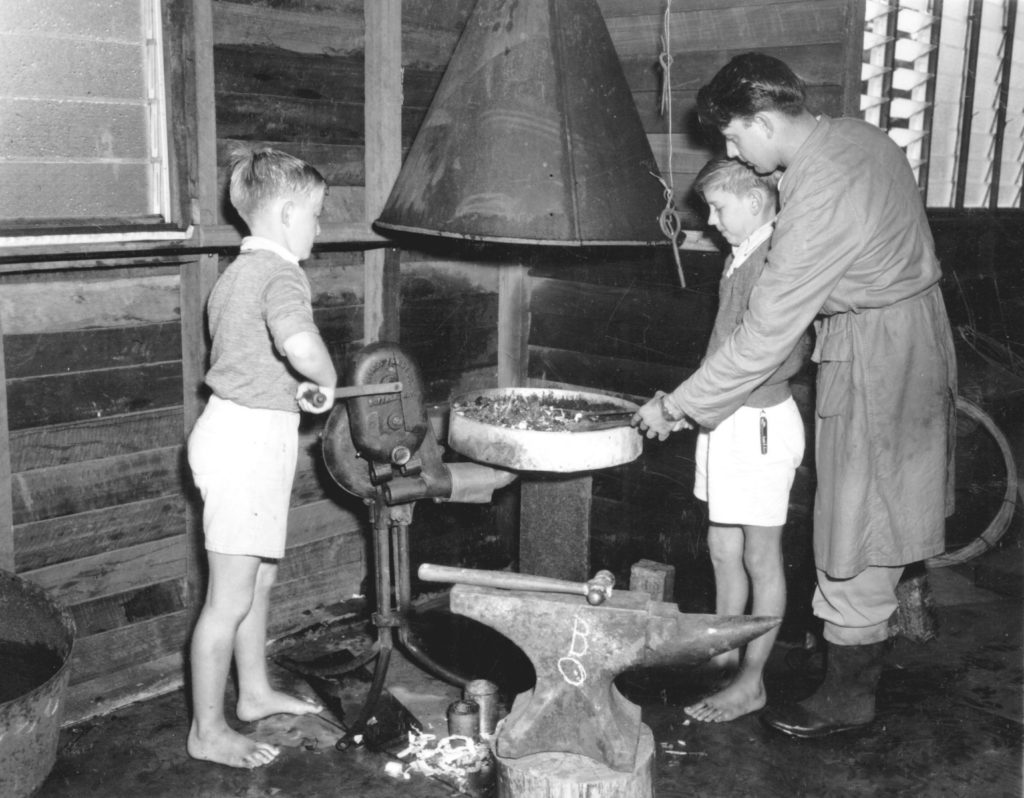 Description: This is a digitised copy of a photographic print and is part of the pair of images titled ‘Instruction of migrant children, Fairbridge [picture]’ held at the State Library of Western Australia. This image shows the boys at the forge in bare feet.