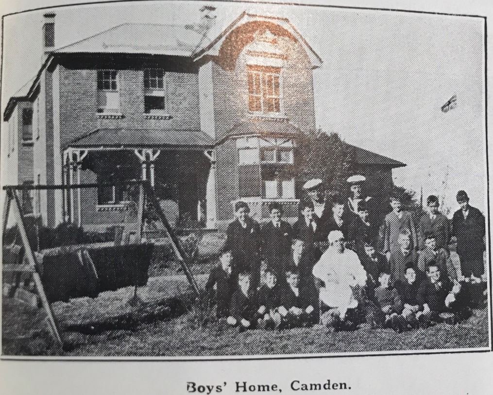 Description: This is an image of Our Boys’ Home in Camden, published by the Sydney Rescue Work Society c.1920 in a pamphlet titled The Cry! Women and Children in Need – Will You Answer It?. The image shows the Boys’ Home (a large two storey brick building) in the background with a group of 21 boys and a woman seated and standing in the foreground. The boys range in age from approximately 7 years old to 15 years old. The two eldest boys are wearing what appears to be a naval uniform.