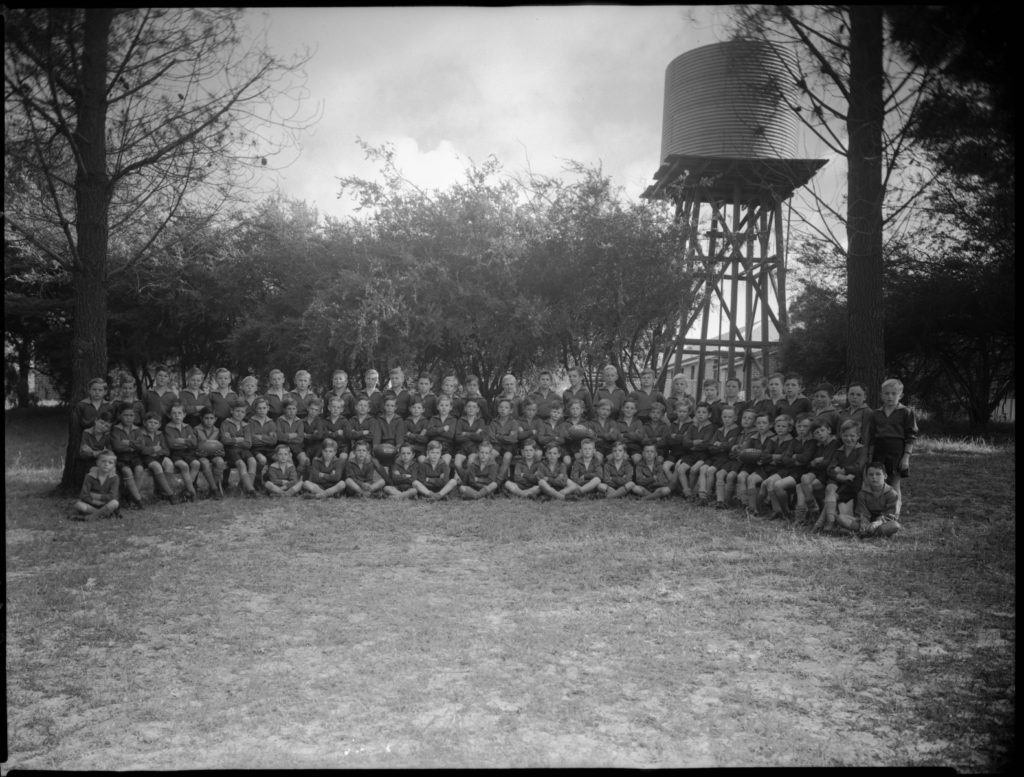 Description: This is a digitised copy of a negatvie and is part of the group of seven images titled ‘Boys at Castledare [picture] held at the State Library of Western Australia. The image shows a large groups of boys posing for a photo in front of a water tower.