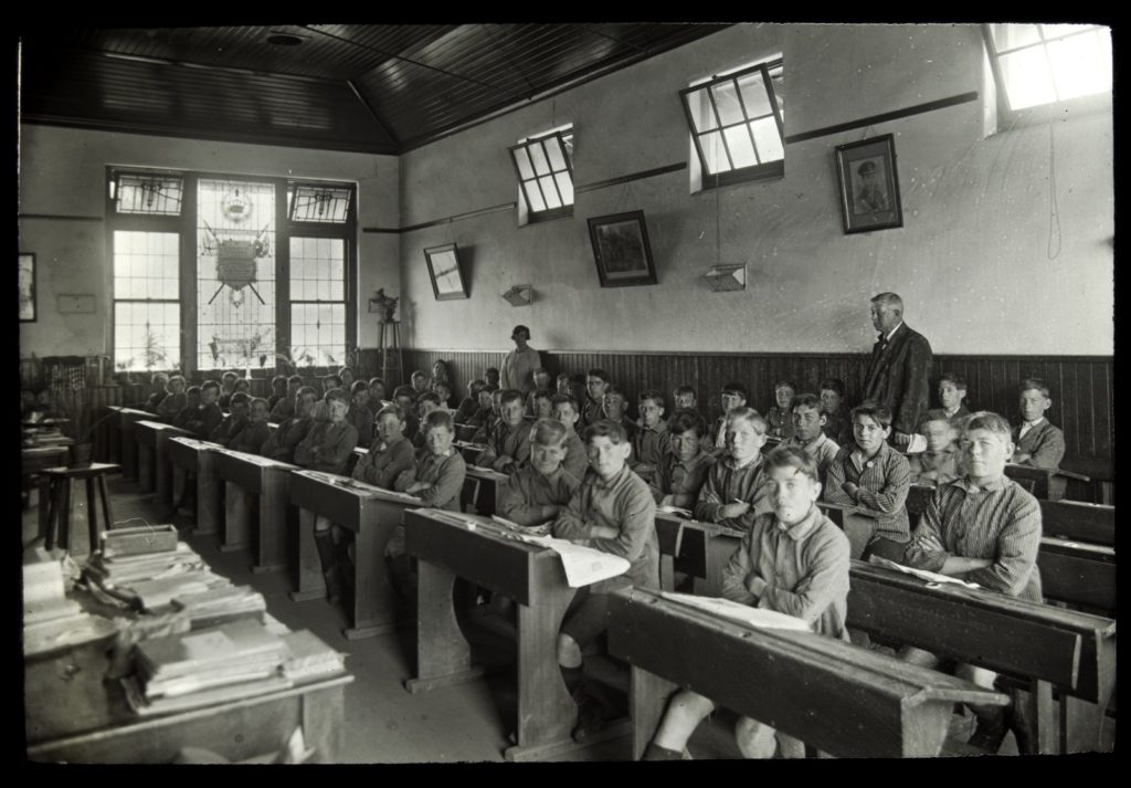 Description: This is a photograph showing boys sitting at their desks inside the classroom at the Clifden Farm and Try Boys Home at Wedderburn. It is part of the Try Boys Society Collection of photographs held by the State Library of Victoria.