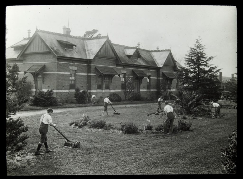 Description: This is a photograph showing boys mowing the lawn and tending to gardens in front of the main building at the Clifden Farm and Try Boys Home at Wedderburn. It is part of the Try Boys Society Collection of photographs heldby the State Library of Victoria.