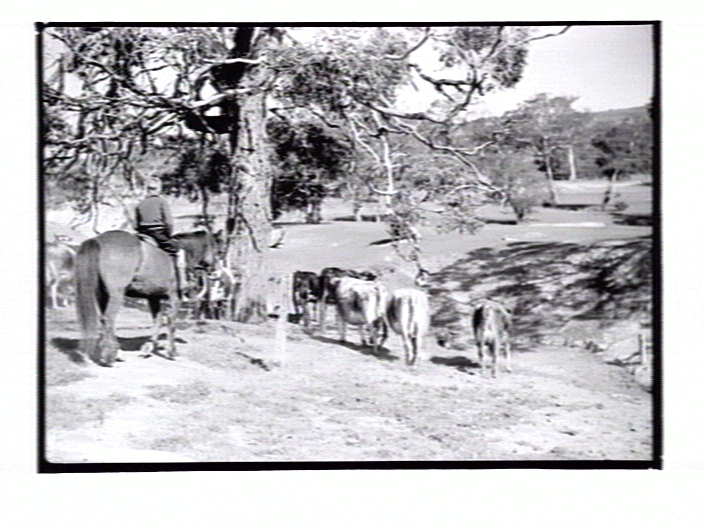 Description: This photograph was taken at Northcote Training Farm school, Glenmore, Victoria. It shows a boy (presumably a resident of the training farm) on horseback with cattle on a farm.