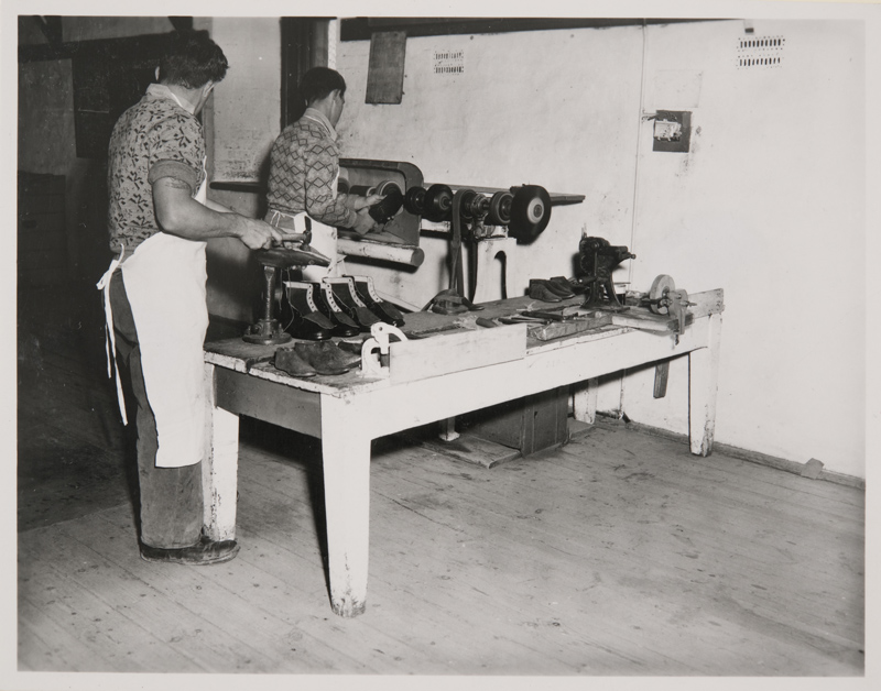 Description: This is a a copy of a photo from the archival series ‘Photographs of Departmental Institutions’, Volume 2, the original caption states: Instruction is given in the manufacturing and repairing of boots and shoes, 1953.