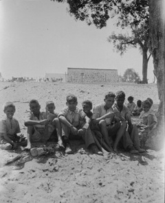 Description: This is a digitised copy of a negative and is part of the Aboriginal people of Western Australia series held at the State Library of Western Australia. The image shows a group of boys sitting under a tree at the Moore River Native Settlement, in the 1930s