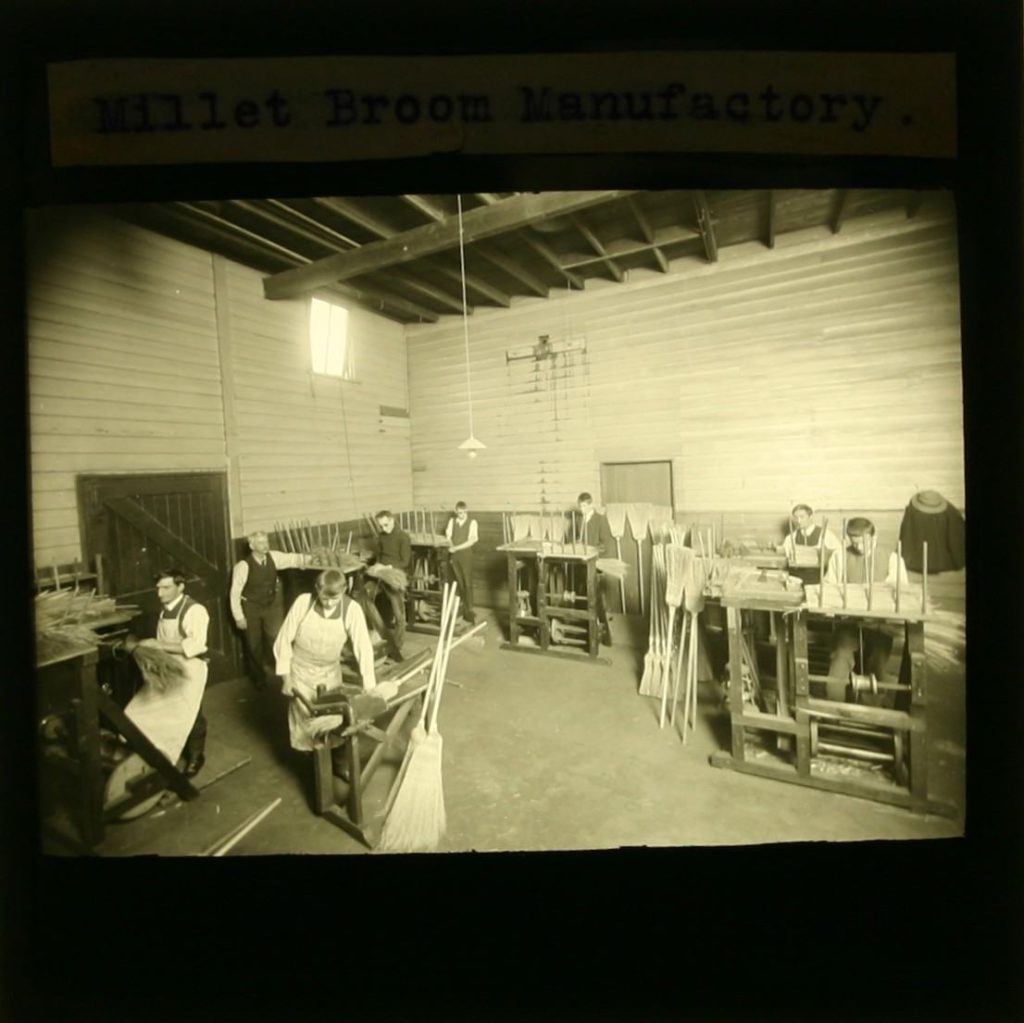 Description: This is an image showing eight boys and men working in the broom making workshop at the Royal Victorian Institute for the Blind. The men and boys are standing at workbenches and are in the process of making brooms, with one man standing near the door, possibly supervising. This image is part of the Royal Victorian Institute for the Blind Collection at Museums Victoria.