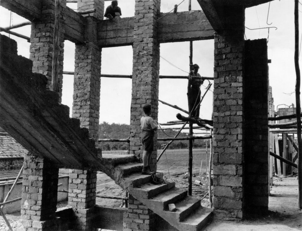 Description: This is a digitised copy of a photoprint and is part of the group of five images called ‘Building construction at Bindoon Boys Town [picture]’ held at the State Library of Western Australia. The image shows boys helping with the construction of the new buildings at Bindoon.