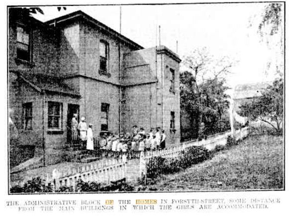 Description: This image shows the building known as ‘Arden’ when it formed part of the Church of England Girls’ Home in Glebe. Girls from the Home can be seen standing outside the building. This image was published in The Sydney Morning Herald on 11 May 1928. The description reads: “The administrative block of the homes in Forsyth-Street, some distance from the main buildings in which the girls are accommodated.”