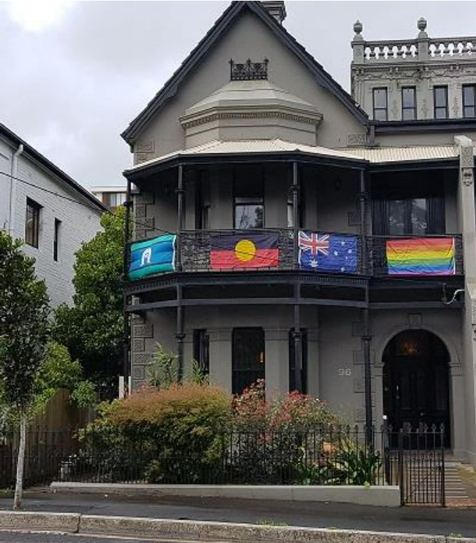 Description: This is a photogrpah of Caretakers Cottage in Bondi. It shows the front of a grey, two-storey terraced building, with the Torres Strait Islands, Aboriginal, Australian, and Pride flags displayed on the 2nd floor verandah. This photograph was published in the Caretakers Cottage 2018 Annual Report.