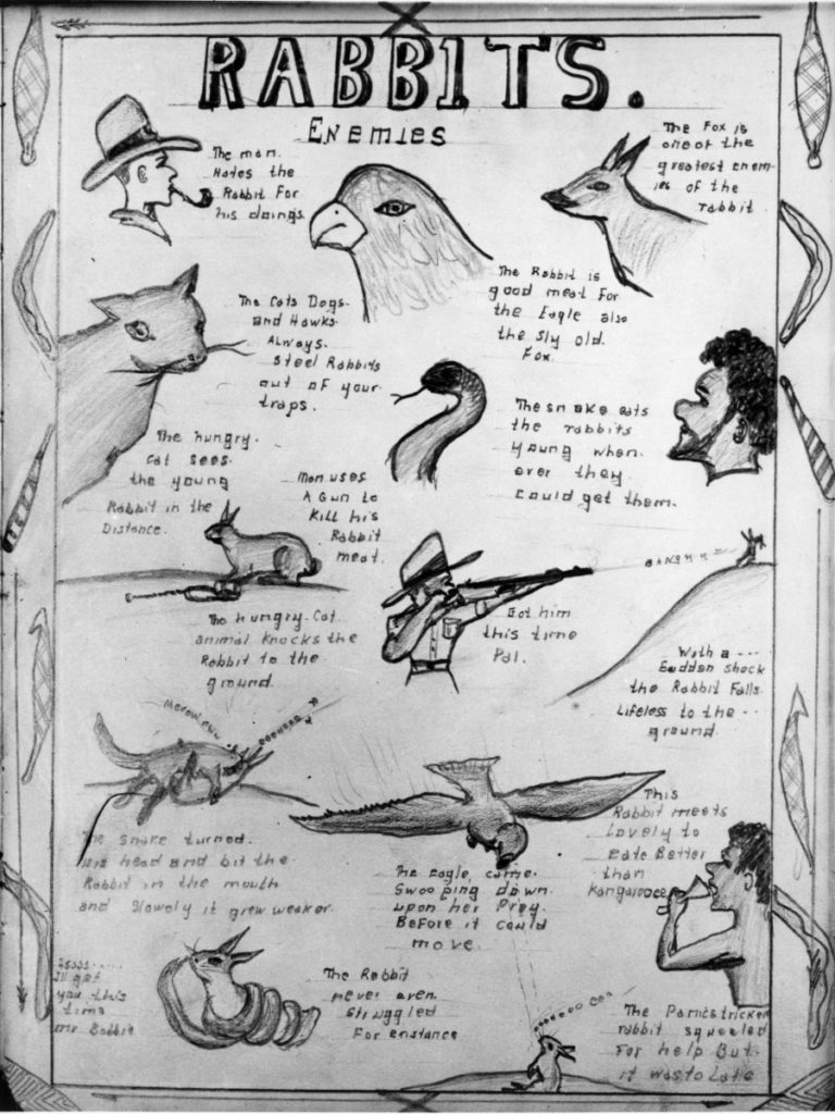 The Sunday Times reported in 1947 that Native Affairs Minister Ross McDonald said ‘much interest was evidenced in the recent exhibition of drawings of children of Carrolup school for natives exhibited in Perth. All the pictures were purchased and realised £74, which will be expended in the interests of the children.’