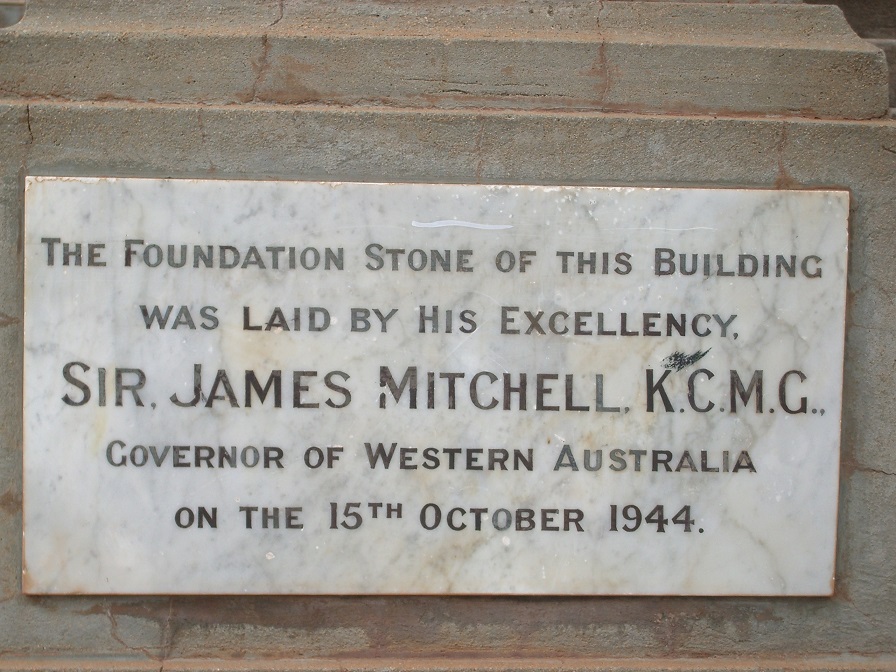 Description: The inscription on the plaque reads “The Foundation Stone of this building was laid by His Excellency, Sir James Mitchell, K.C.M.G., Governor of Western Australia on the 15th October 1944.”