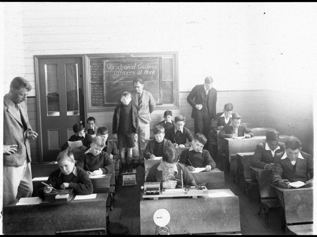 Description: This is a photograph of a classroom at the Mittagong Farm Home. It shows 15 boys and three staff members in the classroom. Most of the boys are seated at their desks, and one is standing on a set of scales. “Vocational Guidance Officers at Work” is written on a blackboard at the back of the room.
