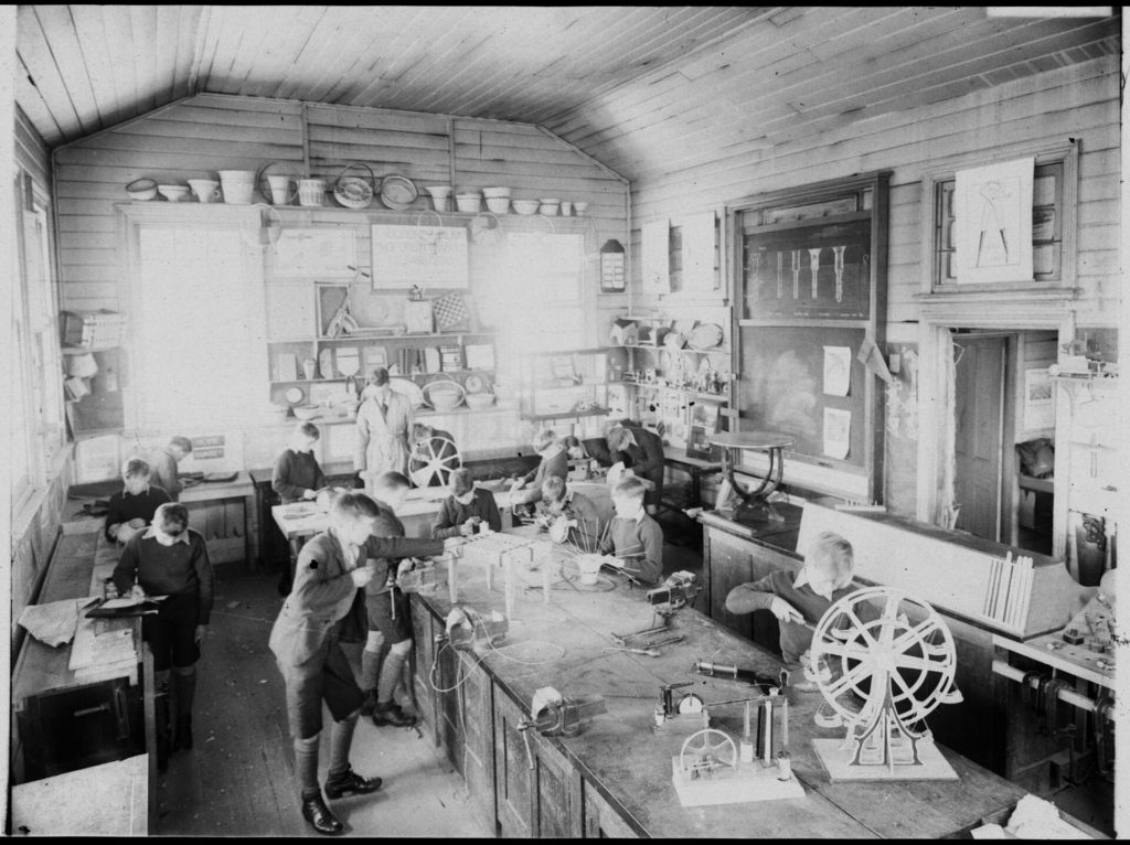 Description: This is a photograph of boys in a workshop at the Mittagong Farm Home. It shows approximately a dozen boys working on a variety of craft and woodwork projects under the supervision of a staff member. The workshop is filled with finished and in-progress projects, including woven baskets, a chess board, tables, and model ferris-wheels.