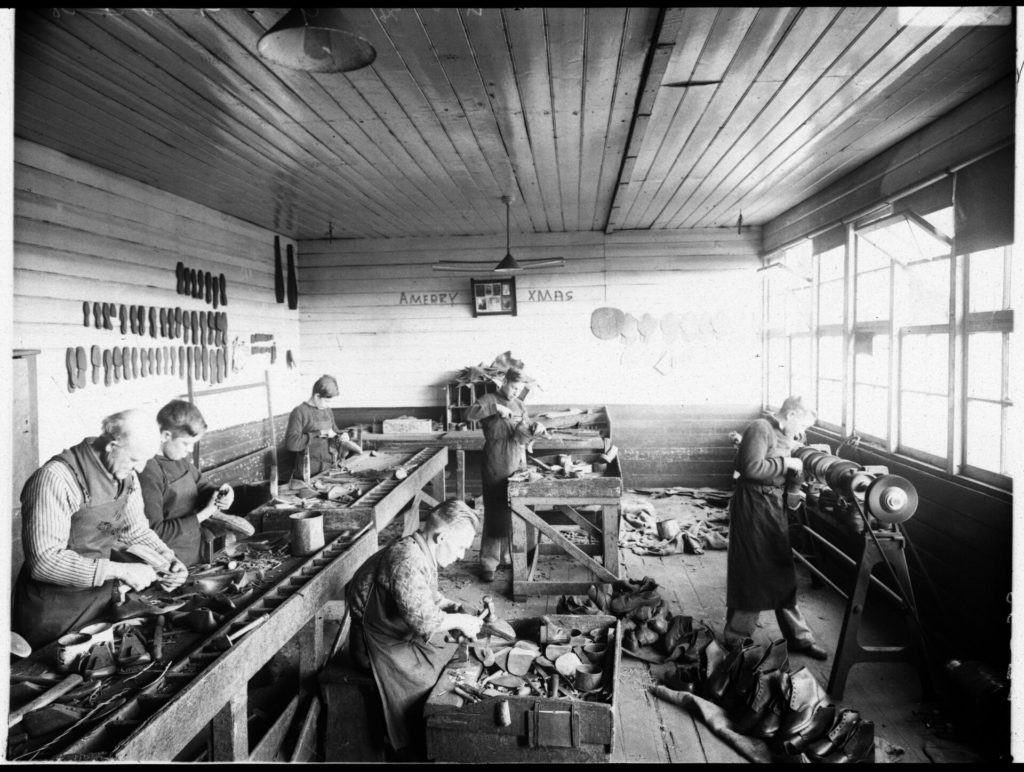 Description: This is a photograph of the cobblers workshop at Mittagong Farm Home. It shows four boys working at various stations alongside two older men making or repairing boots in a small workshop. The workbenches are busy with various materials, and newly made boots are lined up on the floor.