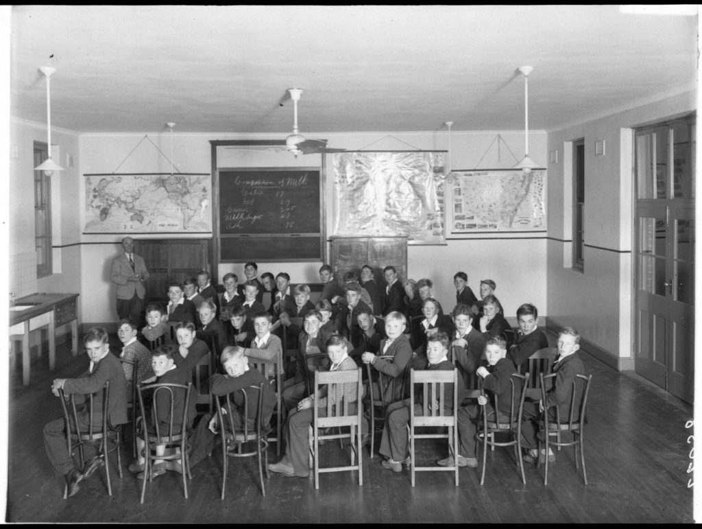 Description: This is a photograph of a classroom full of boys at Berry Training Farm. The class holds approximately 40 boys, who are seated facing a blackboard (but turned around to pose for the camera). A teacher stands next to the blackboard, written on which is a lesson about the composition of milk.