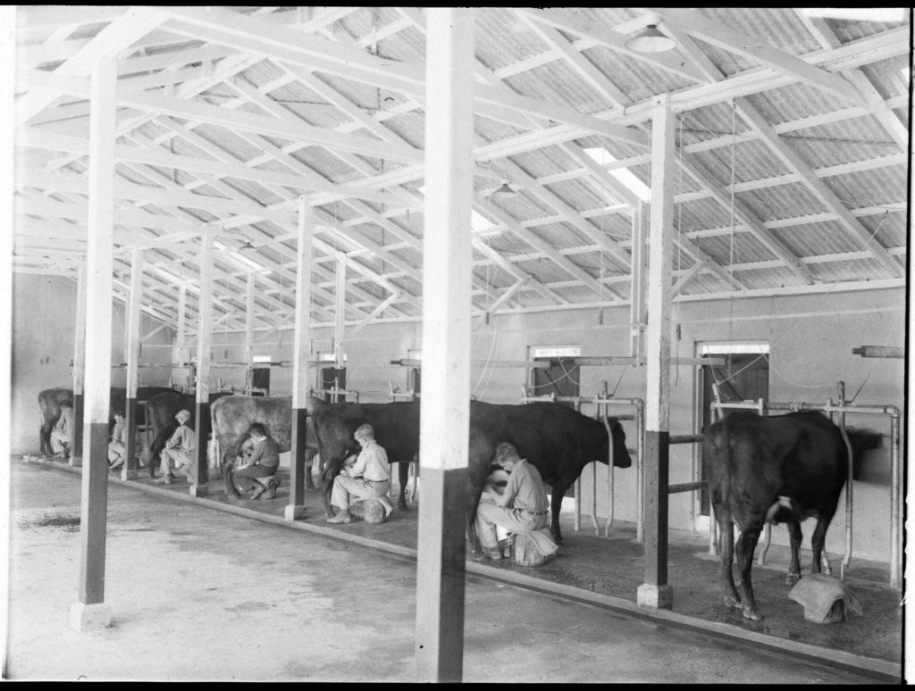 Description: This is a photograph shopwing six boys milking cows in the dairy at Berry Training Farm.