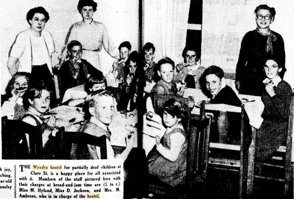 Description: This is an image of children and staff at Wyadra Hostel. Fourteen children are seated around two tables eating bread and jam and three female staff members stand in the background. This photograph appeared as part of a photo-set in The Mercury on 26 March 1954. The caption reads “The Wyadra hostel for partially deaf children at Clare St. is a happy place for all associated with it. Members of the staff puctured here with their charges at bread-and-jam time are (l. to r.) Miss M. Hyland, Miss D. Jackson, and Mrs. M. Ambrose, who is in charge of the hostel.”