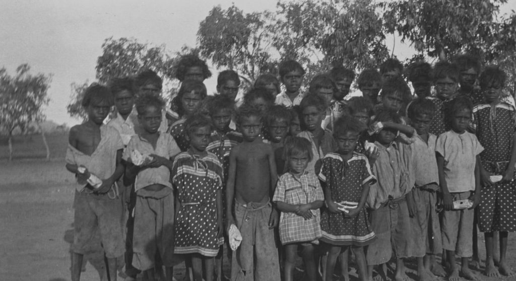 Description: This is a digitised copy of negative and is part of the Aboriginal people of Western Australia series held at the State Library of Western Australia. The image shows a large group of children, some holding small parcels. Most of the girls wear matching spotted dresses.