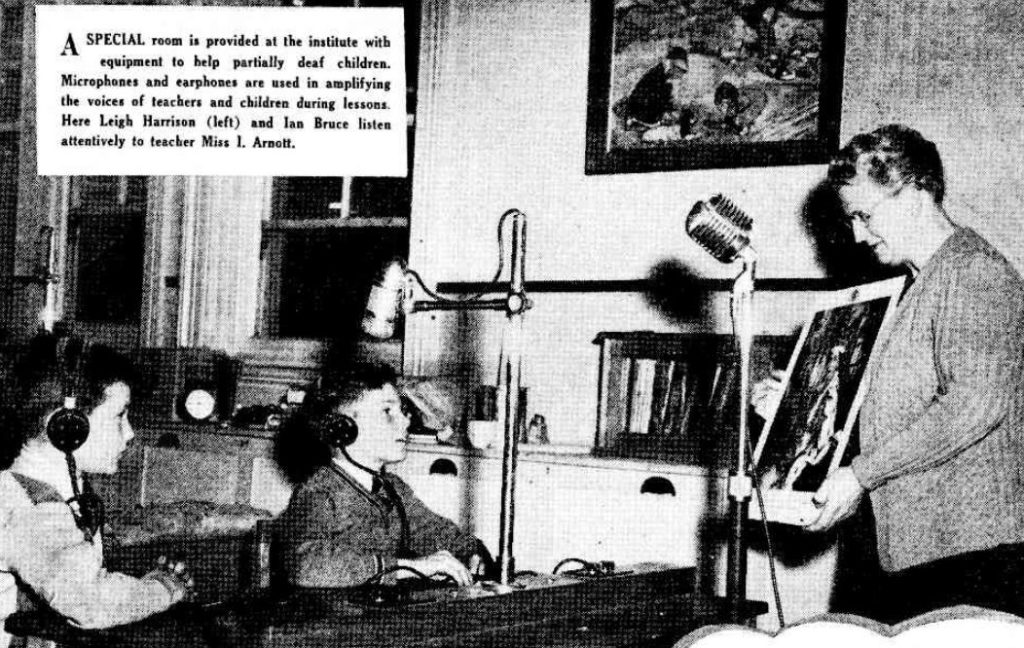 Description: This is a photograph of two boys during a lesson at Wyadra Hostel. They are seated at a desk wearing headphones, with microphones overhead. A woman stands infront of them holding a picture of the Queen. This photograph appeared as part of a photo-set in The Mercury on 26 March 1954. The caption reads “A special room is provided at the institute with equipment to help patrially deaf children. Microphones and earphones are used in amplifying the voices of teachers and children during lessons. Here Leigh Harrison (left) and Ian Bruce listen attentively to teacher Miss I. Arnott.”