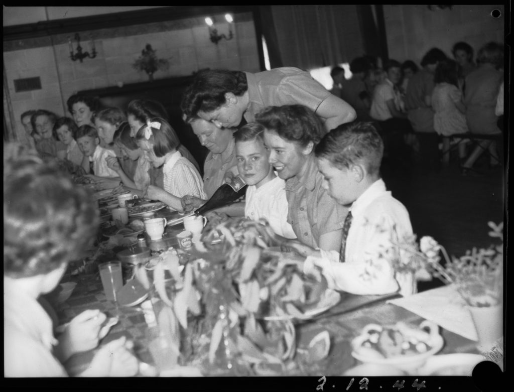 Description: This is a digitised copy of a negative and is part of the group of 10 images titled ‘WAAAF supporting orphans [picture]’ held at the State Library of Western Australia. The image shows children and some adults around a large table with drinks and food.