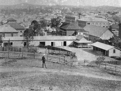 Description: This description was included on the library website: Lady Bowen Hospital located in the centre and to the right, behind the Government Roads Depot (long low building in the foreground.) Government House can be seen in the centre of the background.