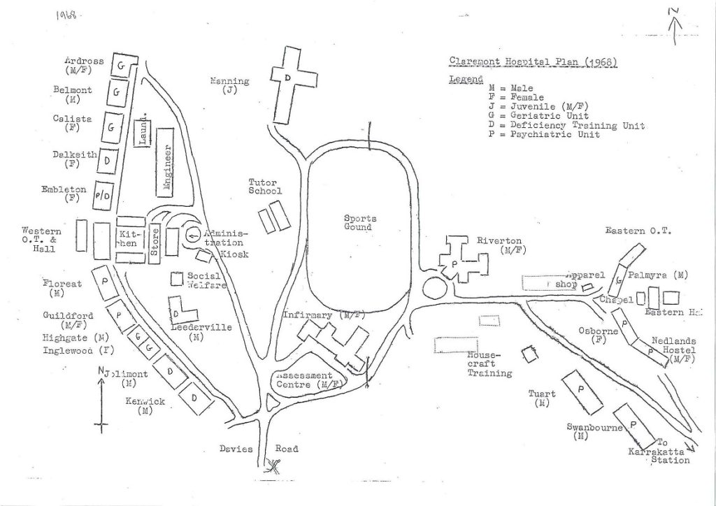 Description: Claremont Hospital Plan, 1968 is a digital copy of an image that was part of the Mental Health Museum WA Inc’s collection of images. The image shows the main facilities at the hospital, including ‘J’ Block, which was the wing for children and young people.