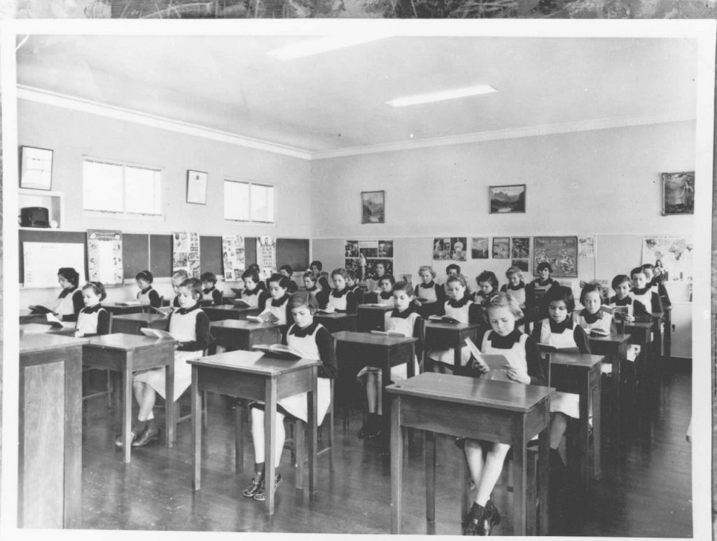 Description: ‘Classroom’ is a digital copy of an undated photograph from the Institute of Sisters of Mercy of Australia and Papua New Guinea Archives and Heritage Centre. It shows students in the St. Maria Goretti School at the St Joseph’s Girls’ Orphanage. The school is known to have been on site in 1953.