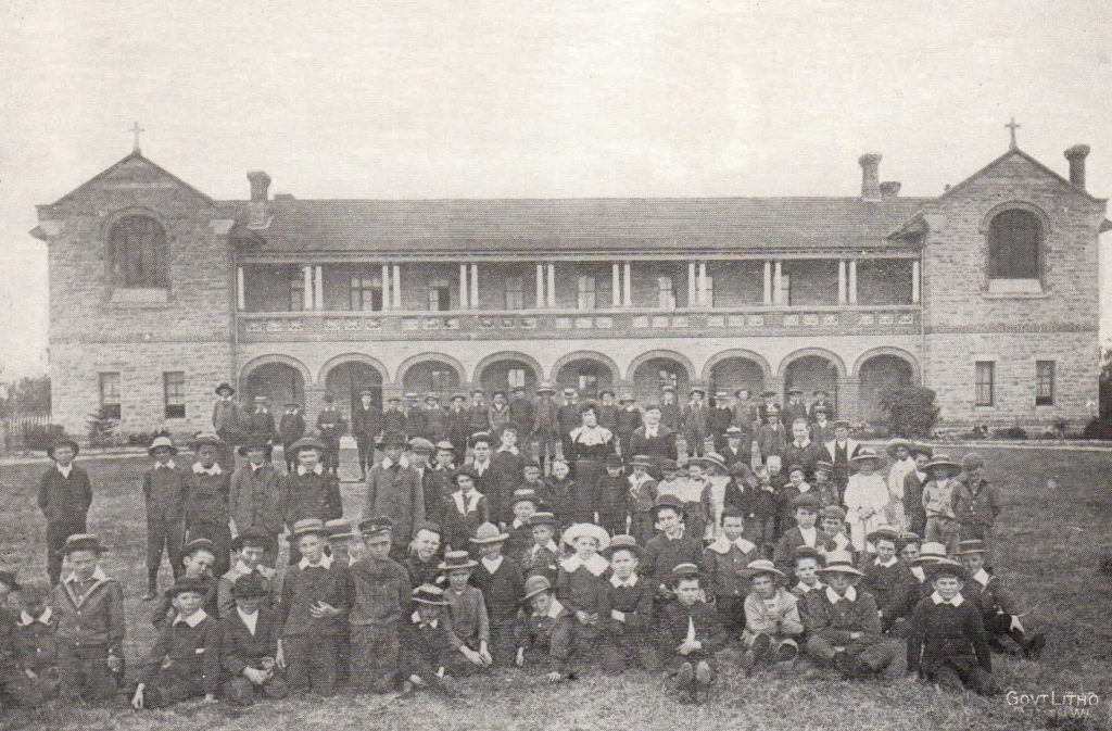 This image shows approximately 80 boys and four adults sitting or standing on the lawn in front of a long, two-storey stone building. The boys range in age from approximately five to 12 years old.